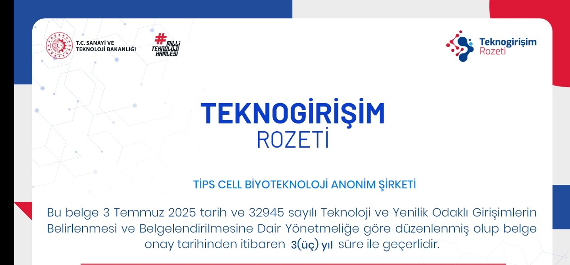 TiPS Cell has been awarded the Techno-Enterprise Badge by the Ministry of Industry and Technology of the Republic of Türkiye.